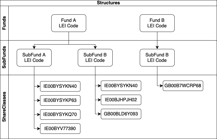 When storing a new Share Class, what happens is, in fact, the creation of a structure in the database. This structure consists of three levels: Fund, SubFund and ShareClass, as illustrated in the below diagram: