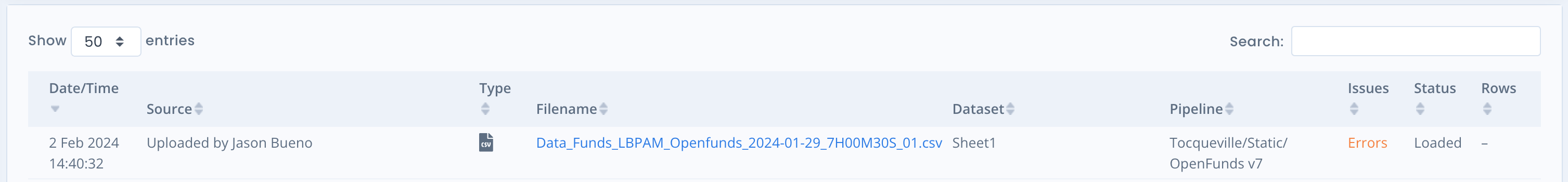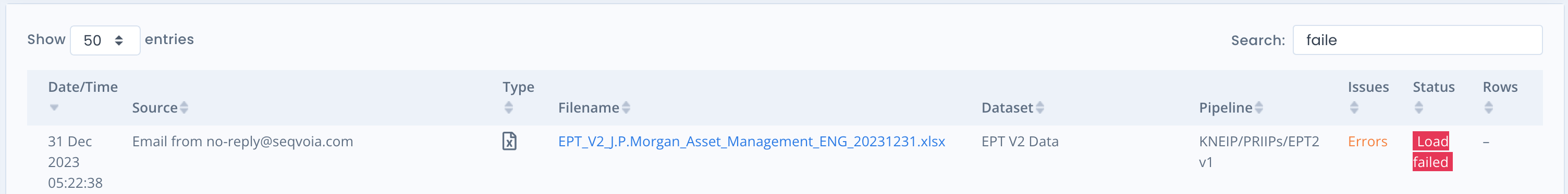 Another possibility is when we have column status populated with 'Load Failed'. In this case, the 'Errors' will also be present in the issues column, but the link will be available in 'Load Failed'