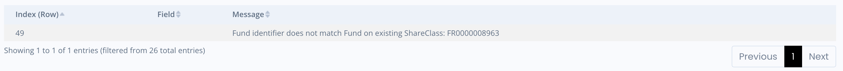 If any of the aforementioned fields are missing in the file, an error message will be raised saying that mandatory information is missing and will not create the share class