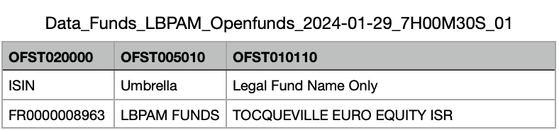 In this case, the file says that the Fund for this ISIN is LBPAM FUNDS but in the system, the Fund is TOCQUEVILLE EURO EQUITY ISR.